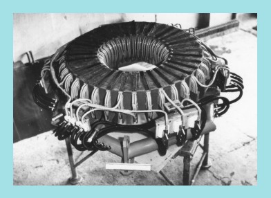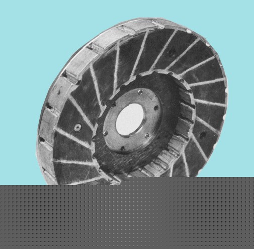 An inductor and one of the versions of a flat angular rotor of an experimental heavy-duty (equipped with water -cooled windings) asynchronous EEM, 1 m in diameter with dismantled operational element and casings. Asynchronous EEM of this type can be efficiently used: